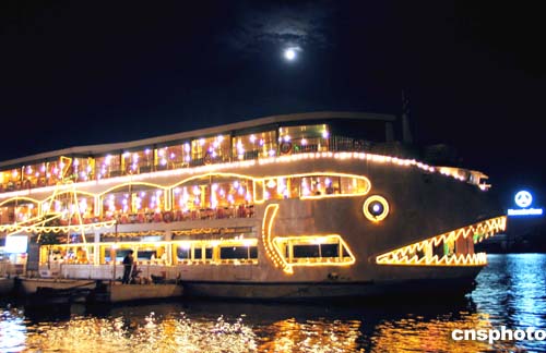越南近年發(fā)展旅游業(yè),在西貢河邊可載三千游客的巨型鯊魚游船燈火通明,游客夜游西貢河別有一番風(fēng)情。作者:周景洛