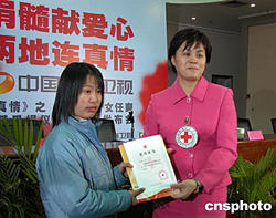 1月3日,湖南省副省長、省紅十字會會長甘霖(右)在長沙向捐獻骨髓的路敏頒發(fā)榮譽證書。來自湖南農業(yè)大學的路敏今日將啟程前往北京提供造血干細胞,以救助遼寧14歲的白血病少女任爽。作者:鄧霞