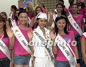 參加由澳門博彩股份有限公司承辦的“世界名模在澳門”活動的第十六屆世界模特小姐大賽三十國冠軍佳麗十七日首次匯聚濠江,在澳門著名的葡京酒店前廣場展示風(fēng)采,圖為中國區(qū)冠軍馬力(左)、上屆世界冠軍延魏(中)和香港冠軍張穎向澳門致意。中新社記者:李剛