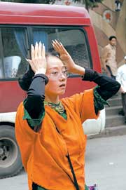 記者見到的楊麗萍風(fēng)采依舊、容光煥發(fā)、婀娜動人,一身大紅大綠的民族特色服裝穿出不一樣的味道?匆娪浾叱霈F(xiàn)在排練的場地,楊麗萍顯然有些吃驚,但是很快露出了笑容。當(dāng)記者問及她的身體恢復(fù)得如何時,楊麗萍很自然地說:“已經(jīng)好了,好了就是好了,現(xiàn)在沒什么病了,不用擔(dān)心!