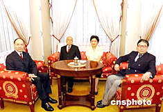 全國政協(xié)副主席、中共中央統(tǒng)戰(zhàn)部部長劉延?xùn)|25日抵達(dá)香港,并看望全國政協(xié)副主席霍英東。圖為霍英東與兒子霍震霆(右)及霍震寰(左)與劉延?xùn)|合照。作者:洪少葵