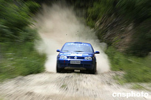 5月29日,2004年全國汽車?yán)﹀\標(biāo)賽“海淀駕校杯”北京拉力賽正式在北京鳳凰嶺拉開帷幕,眾多參賽車隊在崎嶇的賽道上競爭激烈。中新社記者:盛佳鵬