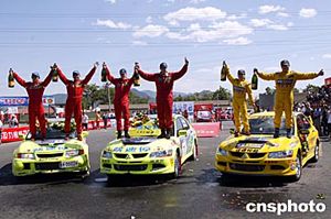 2004年全國汽車?yán)﹀\標(biāo)賽“海淀駕校杯”北京拉力賽經(jīng)過2天激烈的較量5月30日在北京落下帷幕,由于鳳凰嶺惡劣的路況,參賽的68部賽車今天共有49部賽車參加比賽。N組冠軍被咳速停拉力車隊11號車(中)的英國外援大衛(wèi)·辛吉斯/丹尼爾·巴里特獲得,亞軍是佳通輪胎車隊(右)的劉曹東/周麗,咳速停拉力車隊的劉斌/黃煜獲得第三名。中新社記者:盛佳鵬