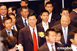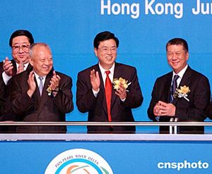特區(qū)行政長(zhǎng)官董建華陪同中共中央政治局委員、廣東省委書(shū)記張德江等與會(huì)官員出席開(kāi)幕式。作者:洪少葵