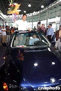 隨著陜西西安“體育彩票造假案”全案告破,六月四日下午,陜西省西安市體彩中心負責(zé)人宣布劉亮于三月二十三日所獲特等A獎彩票有效,并向其當面交付所中得的寶馬轎車。同時,陜西省、西安市體育局負責(zé)人向劉亮公開道歉。圖為劉亮喜獲寶馬車后的情形。作者:李宗文