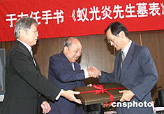 六月十日,泰國著名愛國僑領(lǐng)、原泰國中華總商會主席蟻光炎先生之子蟻錦中(中)、蟻錦桐(左)在北京將于右任手書《蟻光炎先生墓表》原稿無償捐贈給中國國家博物館收藏。中新社記者:史利