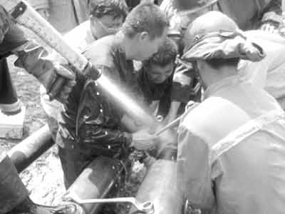 據(jù)朝陽市消防局副局長姚安介紹:“我們共出動(dòng)70余名官兵、10臺消防車。由于汽油管道發(fā)生炸裂,引起了另一條柴油輸送管道的法蘭盤(管道的接頭)向外泄漏柴油,現(xiàn)在這7條輸油管道每條里都有5噸油,一旦引爆后果不堪設(shè)想。我們用兩臺泡沫滅火車和若干水槍給管道降溫,同時(shí)用來稀釋泄漏的柴油,并更換法蘭盤!