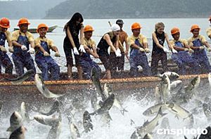 6月21日,參加2004年國際旅游小姐冠軍總決賽的選手們來到浙江著名旅游景區(qū)千島湖與漁民一起進(jìn)行大網(wǎng)捕魚,體驗(yàn)豐收的喜悅。中新社記者:盛佳鵬