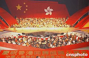 為慶祝香港回歸祖國七周年,中國人民解放軍400人的藝術(shù)團(tuán)將與23日、24日在香港紅(石+勘)體育館舉行兩場盛大演出。22日下午全體演職人員在現(xiàn)場進(jìn)行第一次走臺(tái)排練。作者:趙振清