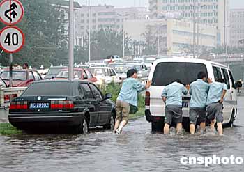 中新網7月10日電(記者 聞育旻) 10日下午4時許,北京上空電閃雷鳴,突遭瓢潑大雨,北京城區(qū)部分街道水深及膝蓋,部分車輛因發(fā)動機進水而癱瘓于路中,城區(qū)交通嚴重擁堵。