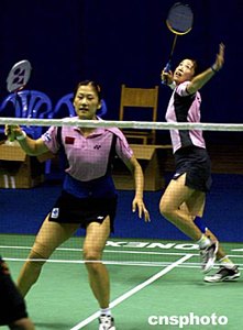 中國(guó)羽毛球隊(duì)女雙隊(duì)員黃穗(前)、上屆奧運(yùn)會(huì)混雙冠軍高崚,十五日在湖南益陽(yáng)訓(xùn)練基地緊張訓(xùn)練,備戰(zhàn)雅典奧運(yùn)會(huì)。中新社記者:宋吉河  趙婷婷緊張備戰(zhàn)雅典奧運(yùn)。中新社記者:宋吉河