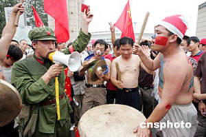 七月十七日,一名中國球迷身著解放軍舊式軍服,手舉“紅寶書”,和同伴一起祝愿中國足球隊(duì)在亞洲杯賽上取得好成績。二零零四年亞洲杯足球賽當(dāng)晚在北京開幕。中新社記者:毛建軍