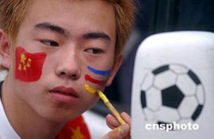 七月十七日,二零零四年亞洲杯足球賽揭幕戰(zhàn)將在中國隊和巴林隊之間展開,一位中國球迷認(rèn)真描畫臉譜,為中國隊加油。中新社記者:武仲林