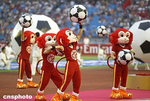七月十七日晚,二零零四年亞洲杯足球賽開(kāi)幕式在北京工人體育場(chǎng)舉行,本屆亞洲杯吉祥物貝貝在開(kāi)幕式上出盡風(fēng)頭。中新社記者:盛佳鵬