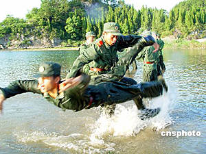 7月18日,浙江省仙居縣武警官兵頂著烈日,冒著酷暑進(jìn)行水上高難項目訓(xùn)練。為適應(yīng)水上戰(zhàn)斗能力,仙居縣武警官兵頂著烈日,開始進(jìn)行為期15天的水上訓(xùn)練。華文武 攝