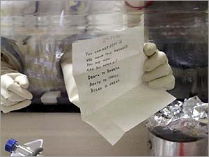2001年發(fā)生的炭菌襲擊共造成5人死亡、17人受傷。911襲擊一個(gè)月后,沾有炭菌粉末的郵件被投寄到政府辦公室、新聞機(jī)構(gòu)、紐約郵局和多名參議員,造成多家機(jī)構(gòu)關(guān)閉,老百姓人心動(dòng)蕩。目前還沒有一人因炭菌襲擊被起訴。