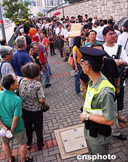 事前,駐港部隊已預先公告將于今日上午分別在港島中環(huán)軍營、九龍槍會山軍營和石崗軍營設點派發(fā)個人參觀券。一萬五千張參觀券中,個人券有一萬二千張,其余為團體券;市民每人最多可領取三張個人券。