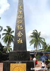 二○○四年七月下旬,在海南興隆華僑農(nóng)場的亞洲熱帶風情園里,豎立著兩尊黑色金字的柱子。據(jù)悉,它們是香港與澳門回歸紀念柱,這兩尊柱子是該風情園的一大景觀。作者:顧時宏