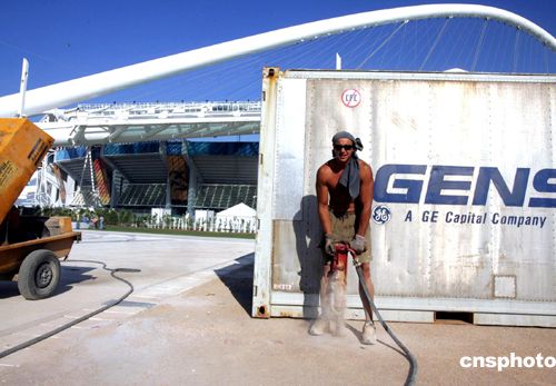 (當(dāng)?shù)貢r間)二○○四年八月二日上午,一名鉆工在希臘雅典奧運(yùn)會主會場外冒著烈日安裝配套設(shè)施,雅典奧運(yùn)會主會場建設(shè)工程已經(jīng)收尾。中新社記者:任晨鳴