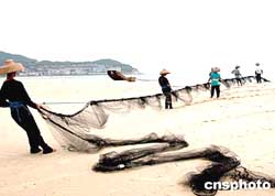二○○四年六月一日至八月一日是廣東實(shí)施伏季休漁的第六個(gè)年頭,南海海域伏季休漁期間,共有一萬(wàn)多艘漁船、十萬(wàn)多漁民休漁。圖為廣東陽(yáng)江漁民在下網(wǎng)捕魚(yú)。作者:劉衛(wèi)勇