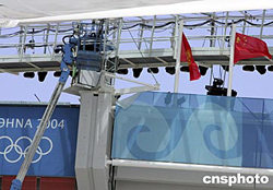 當(dāng)?shù)貢r間8月2日中午,驕陽映照正在緊張排練奧運會開幕式的希臘雅典奧運會主會場。國際奧委會所有會員的旗幟在體育場四周依次排列,鮮艷的中國國旗在體育場西南方向迎風(fēng)飄揚。中新社記者:任晨鳴