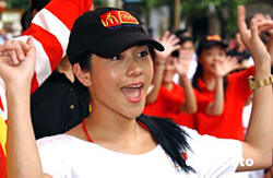 香港麥當(dāng)勞4日在銅羅灣時代廣場舉行早餐誓師大會﹐呼吁香港人身體力行﹐踏上健康路﹐每天步行一萬步﹐影星林嘉欣出席﹐并與眾人一起﹐步行100步﹐踏上健康路。作者:趙振清