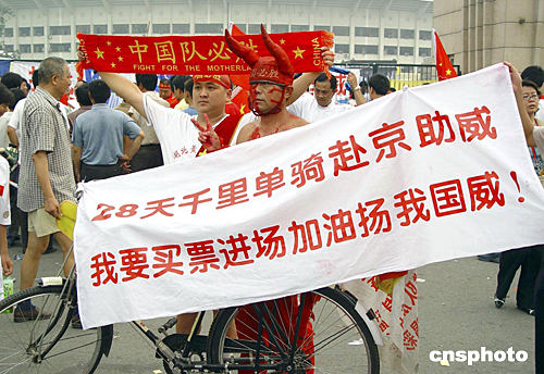 8月7日晚八時,2004年亞洲杯足球賽決賽中國隊與日本隊的比賽將在北京工人體育場舉行,各地球迷提前到達(dá)北京工人體育場為中國隊加油。圖為北京工人體育場外為中國隊加油的球迷。
