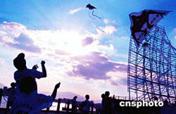 雙休日,近百名影迷來(lái)到閩江畔,滿懷喜悅放飛印有“蜘蛛俠”圖案的風(fēng)箏。時(shí)下,美國(guó)大片《蜘蛛俠2》在福州各大影院上映,受到眾多青年觀眾的喜愛(ài)。作者:劉可耕