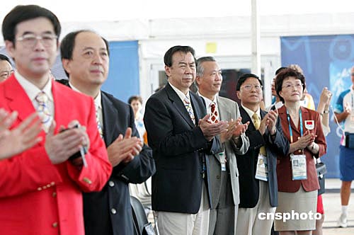 當(dāng)?shù)貢r間八月九日上午,參加雅典奧運會的中國體育代表團(tuán)在雅典奧運選手村舉行升旗儀式。中新社記者:毛建軍