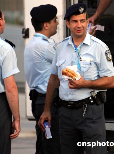 當地時間八月九日中午,幾名參與雅典奧運會安保的希臘警察依次領取簡易的工作午餐。中新社記者:任晨鳴