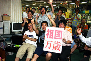 這次活動(dòng)是由大阪的中文報(bào)紙《關(guān)西華文時(shí)報(bào)》策劃組織的,地點(diǎn)在市中心的中華城,數(shù)十名中國(guó)人球迷在鮮艷的五星紅旗下,高舉“祖國(guó)萬(wàn)歲”的標(biāo)語(yǔ)牌,邊觀看大屏幕電視,邊為中國(guó)隊(duì)吶喊助威的。日本有名的電視臺(tái)每日電視臺(tái)專門(mén)派出了一個(gè)攝制小組進(jìn)行現(xiàn)場(chǎng)采訪。