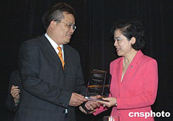 美東時間八月十二日,由美國聯邦政府舉辦的紐約區(qū)二○○四年少數族裔企業(yè)發(fā)展周活動在紐約開幕。美國商務部少數族裔商業(yè)發(fā)展署副署長董繼玲(右)向《星島日報》紐約公司執(zhí)行總監(jiān)梅建國(左)頒發(fā)獎杯,表彰《星島日報》成為本年度美國少數族裔的最佳企業(yè)。作者:陳建