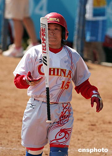 當?shù)貢r間八月十六日,在雅典奧運女子壘球比賽中,中國隊四比二戰(zhàn)勝加拿大隊。中新社記者:毛建軍