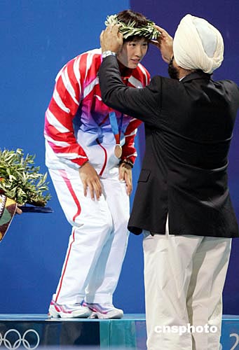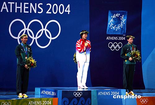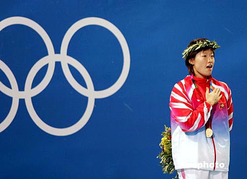 參加雅典奧運(yùn)會游泳比賽的中國選手極少擁有問鼎獎牌實(shí)力者,羅雪娟在當(dāng)?shù)貢r(shí)間八月十六日晚奇跡般奪得女子一百米蛙泳金牌。這是她登上領(lǐng)獎臺最高層,頭戴橄欖桂冠,面對冉冉升起的中國國旗激動得和唱著國歌。中新社記者:任晨鳴