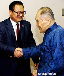 大會(huì)主席周茳釤鈞(右)、副主席王錦彪(左),看望香港南洋商業(yè)銀行名譽(yù)董事長莊世平先生,并征求莊老對(duì)大會(huì)的建議。