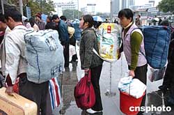一月十三日,在廣州火車站已陸續(xù)看到外來民工離粵返鄉(xiāng)過年。盡管春運(yùn)未至,許多及時(shí)領(lǐng)到工錢的民工趁鐵路客運(yùn)高峰還未到來,早早啟程回家。作者:陳文