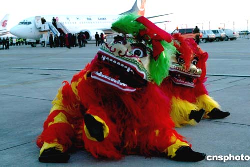 中國國際航空公司的CA1087/8航班一月二十九日上午七時四十六分從北京首都國際機(jī)場出發(fā)飛往臺北,這是五十六年來大陸民航班機(jī)首度飛往臺灣。圖為首航儀式上的舞獅表演。作者:滿會喬