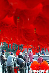 二月三日,北京地壇廟會(huì)喜慶火紅的燈籠吸引了提前逛廟會(huì)的游客。北京久負(fù)盛名的地壇廟會(huì)準(zhǔn)備工作已接近尾聲。作者:韓藝冰