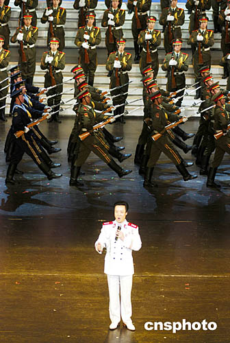 眾多解放軍文藝工作者歷時三個月創(chuàng)作的2005年軍民迎新春文藝晚會,二日晚在北京中國劇院隆重與廣大軍民見面。圖為解放軍總政治部歌舞團(tuán)歌唱演員閻維文與中國人民解放軍儀仗大隊官兵,表演男聲獨唱與軍體操《軍旗下的我們》。中新社記者:王麗南