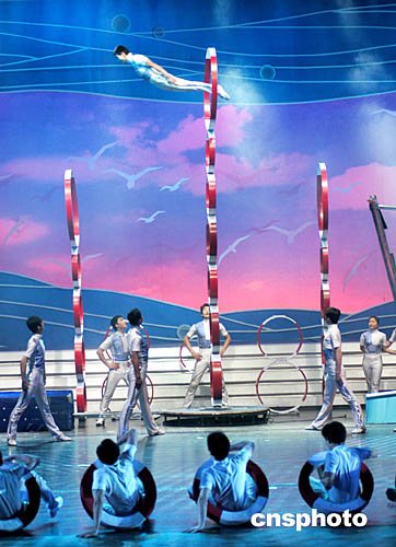 春節(jié)來臨,解放軍沈陽軍區(qū)雜技團的演員在2005年軍民迎新春文藝晚會表演雜技《踏浪飛歌》時,以極度高難的翻騰技巧,準確地穿越用十個軍用救生圈直立羅列的高達九米的鉆圈技巧,展示解放軍勇敢的精神風(fēng)貌。中新社記者:王麗南