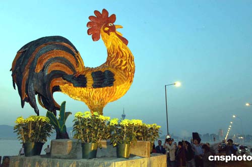 雄雞賀新春,七日,澳門民政總署為一座高三米的“生肖雞”塑像舉行揭幕儀式,這座雄雞色彩斑斕,氣度不凡,祈望為澳門帶來好運(yùn)。作者:梁永強(qiáng)