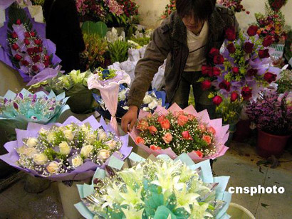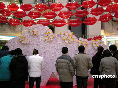 情人節(jié)前夕,錫城市場上的各種情人應(yīng)節(jié)禮品、紅色玫瑰等受到年青人的追捧。無錫一些商家推出的許愿墻上許心愿活動異;鸨,對對情侶紛紛買來許愿牌、同心結(jié),寫上祝福貼在各種“心”形墻上,希望能將情意綿綿的情話捎給心愛的人。作者:潘正光
