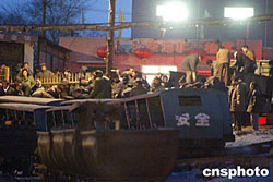 遼寧阜新礦業(yè)集團孫家灣煤礦海州立井“2·14”特大瓦斯爆炸事故發(fā)生后,搜救人員又搜尋到六具失蹤礦工的遺體,截至二月十六日早上,遇難礦工人數(shù)上升到二百零九人,受傷人數(shù)二十九人,仍有六人失蹤。目前共有二百零四具遇難礦工遺體升井,井下五人遺體已確定具體位置。圖為搜救人員當日早上正在礦井口運送遇難者遺體。