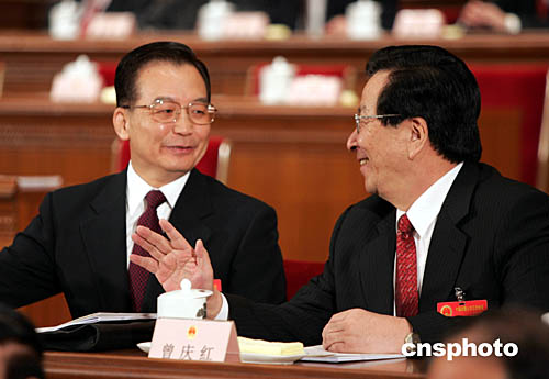 圖:溫家寶和曾慶紅在人大開幕會(huì)上交談