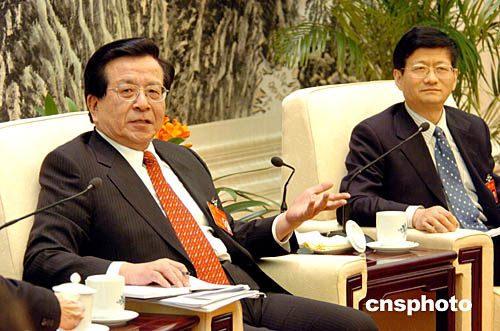 中共中央政治局常委、國(guó)家副主席曾慶紅三月五日到全國(guó)人大江西團(tuán)與代表們一起審議溫家寶總理所作政府工作報(bào)告。 作者:陳文