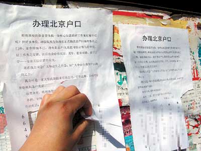 昨日中午,記者在北京林業(yè)大學餐廳外,發(fā)現(xiàn)路旁有兩塊宣傳欄,上面貼滿了考研信息的廣告。在知情人的指引下,記者在宣傳欄背后發(fā)現(xiàn)了戶口辦理廣告!稗k理北京戶口”幾個大字很顯眼,正文用了一半的篇幅來“闡述”畢業(yè)生沒有北京戶口帶來的“無法估量的損失”。接著該廣告稱,該公司是一家大型高新技術(shù)信息公司、“信譽良好”,并保證“幫你順利落戶北京”,“收費合理,絕對保您滿意!”廣告最后注明費用為5萬元,并留下該公司聯(lián)系電話。