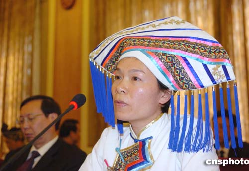 圖:廣西壯族女代表在審議“兩高”報告會議上發(fā)言