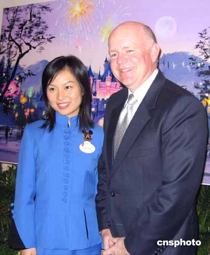 為了在開業(yè)前進行更好的推廣,香港迪斯尼的第一位親善大使已經(jīng)上任。這位名叫杜苡樂(左)的“美眉”,祖籍上海,來自在臺北,工作在香港,有著兩岸三地的親和力。她與香港迪斯尼集團行政總裁羅彬深(右),九日一同出席推廣活動。作者:關(guān)向東