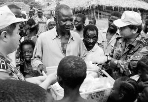 利比里亞地處西非,原是一個(gè)美麗富饒的國度。然而,長達(dá)14年的內(nèi)戰(zhàn),使這個(gè)苦難的國家政局動(dòng)蕩、戰(zhàn)亂困擾、經(jīng)濟(jì)近乎崩潰。2003年11月,奉國務(wù)院、中央軍委命令,以福州總醫(yī)院醫(yī)務(wù)人員為主體組建的南京軍區(qū)首支赴利比里亞維和醫(yī)療分隊(duì)成立。這支包括32名男隊(duì)員和11名女隊(duì)員的醫(yī)療分隊(duì),有外科、內(nèi)科、眼科、牙科以及麻醉、藥劑、檢驗(yàn)、放射醫(yī)師和重癥監(jiān)護(hù)護(hù)士、手術(shù)護(hù)士、衛(wèi)生員,還有駕駛員、通信技師、水電工、廚師等保障人員。
