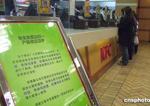 三月二十二日,北京市民在肯德基王府井店內(nèi)購(gòu)買食品。三天前停止售賣的肯德基香辣雞腿漢堡、香辣雞翅、勁爆雞米花當(dāng)天重新上市。肯德基發(fā)布店堂告示,稱這三種產(chǎn)品經(jīng)北京食品安全協(xié)調(diào)辦公室檢驗(yàn)復(fù)查不含蘇丹紅,于二十二日正式恢復(fù)銷售。作者:韓藝冰